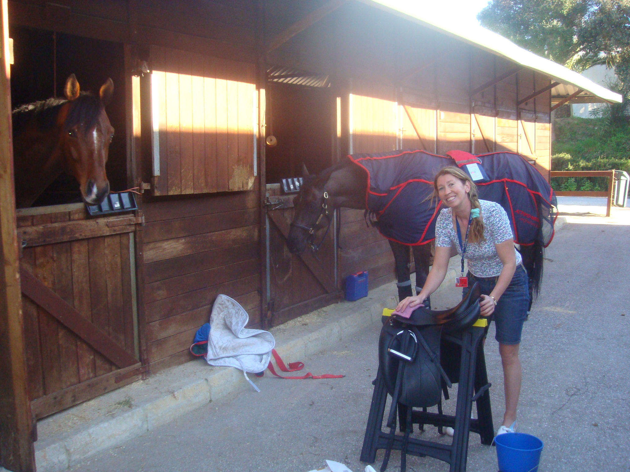 We slept in till 7.30 am wow! Must have been shattered ! The boys were really chilled out gave them breakfast hay muck out, and then went back to the lorry continuing setting up camp. I then went back to ride Zaino who initially was a little apprehensive about leaving his new best friend BB to walk down the lovely sandy tracks to the arena. We crossed a small bridge and into the arena I was amazed he went across the bridge !!! He was a lot fresher today than yesterday ! But I managed to keep his attention, he then worked very well for about 40 mins at which time Phil turned up on his borrowed bike (thanks Dad) and we both went out for a little hack in the pine forest which was fantastic. Phil then helped with washing down Zaino and getting BB ready (I wish we had water pressure at home like they do here) it takes 3 seconds to fill a big water bucket !!! Brennus was very distracted today and very very fresh but 40 min later he was beginning to get tired and starting to settle RELIEF !!! and again Phil and I went out for our small hack the weather is perfect beautiful blue sky about 20 ish degrees its just wonderful. We hosed of BB fed lunch and went back to the lorry for some lunch ourselves its now 2pm. What an amazing job Phil had done on the lorry whilst I was doing Zaino, he has actually laid carpet in the back where the horses go after thoroughly cleaning it out and lighting the fragrant candle Sue bought us (thanks Sue) its a wonderful dressing room and wardrobe!!! Having had some lunch we took a walk up to Show Jumping to get our identification/security passes. Security reassuringly is extremely tight here with guards on regular patrol around the stables and lorry park. We then returned to stable to start on tack cleaning etc!